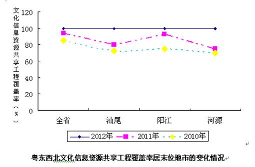 從文化信息資源共享工程覆蓋率來看,文化信息資源共享工程覆蓋率反映了公共文化資源建設情況。2012年全省文化信息資源共享工程覆蓋率達到 100%,比2011年提高6.06個百分點,比2010年提高14.89個百分點。2010年文化信息資源共享工程覆蓋率,粵東最低的地市是汕尾,為 73%,2012年達到100%,提高了27個百分點;粵西最低的地市是陽江,為75%, 2012年達到100%,提高了25個百分點;粵北最低的地市是河源,為70%, 2012年達到100%,提高了30個百分點。(見下圖)