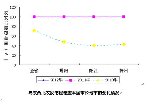 從農家書屋的覆蓋率來看,粵東西北地區也得到了顯著發展。2012年全省農家書屋覆蓋率達到100%,這一指標2011年就實現了100%覆蓋,比 2010年提高28.64個百分點。2010年農家書屋覆蓋率,粵東最低的地市是揭陽,為47.61%,2011年就達到100%,提高了52.39個百 分點;粵西最低的地市是陽江,為40.2%, 2011年就達到100%,提高了59.8個百分點;粵北最低的地市是梅州,為42.7%, 2011年就達到100%,提高了57.3個百分點(見下圖)。