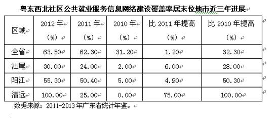 從社區公共就業服務信息網絡建設覆蓋率來看,2012年全省的社區公共就業服務信息網絡建設覆蓋率達到63.5%,比2011年提高1.2個百分 點,比2010年提高32.3個百分點。2010年社區公共就業服務信息網絡建設覆蓋率,粵東最低的地市是汕尾,為2%,2012年達到30%,提高了 28個百分點;粵西最低的地市是陽江,為5%,2012年達到55.3%,提高了50.3個百分點;粵北最低的地市是清遠,為0,2012年達到 100%。從整體來看,粵東西北地區的社區公共就業服務信息網絡建設覆蓋率仍然低于全省平均水平(見下表)。