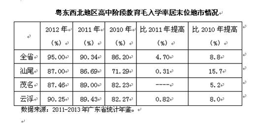 從高中階段毛入學率來看,2012年全省高中階段毛入學率達到95%,比2011年提高4.7個百分點,比2010年提高8.8個百分點。2010 年高中階段毛入學率,粵東最低的地市是汕尾,為71.29%,2012年達到87%,提高了15.7個百分點;粵西最低的地市是茂名,為82.23%, 2012年達到87.46%,提高了5.2個百分點;粵北最低的地市是云浮,為82.27%, 2012年達到90.25%,提高了8個百分點(見下表)。