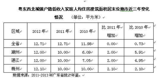 從城鎮戶籍低收入家庭人均住房建筑面積來看,2012年全省城鎮戶籍低收入家庭人均住房建筑面積達到12.71平方米,與2011年持平,比 2010年增加0.73平方米。2010年城鎮戶籍低收入家庭人均住房建筑面積,粵東最低的地市是潮州,為6.09平方米,2012年達到12平方米,增 加了5.91平方米;粵西最低的地市是湛江,為7.05平方米,2012年達到12平方米,增加了4.95平方米;粵北最低的地市是梅州,為10平方 米,2012年達到12.1平方米,增加了2.1平方米(見下表)。