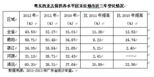 以五保供養水平為例,2012年全省五保供養水平達到43.53%,比2011年提高11.26個百分點,比2010年提高12.52個百分 點。2010年五保供養水平,粵東最低的地市是揭陽,為34.97%,2012年達到59.71%,提高了24.74個百分點;粵西最低的地市是湛江,為 21.65%, 2012年達到24.05%,提高了2.4個百分點;粵北最低的地市是河源,為32.43%, 但到2012年略降為31.12%;2010年粵北另一五保供養水平水平較低地市是清遠,為37.64%, 2012年達到60.2%,提高了22.56個百分點。可見,盡管部分地市五保供養水平得到顯著提升,但作為底線民生的基本指標,粵東西北地區仍有部分地 市的五保供養水平低于全省平均水平(見下表)。