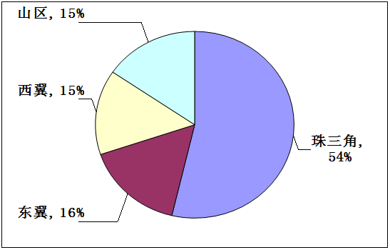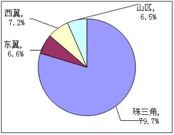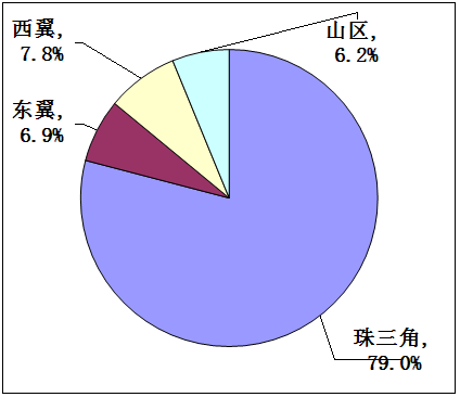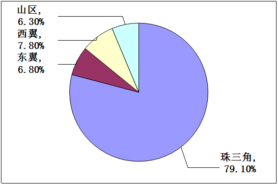 1.從經(jīng)濟總量的分布來看,粵東西北地區(qū)的面積約占全省七成,人口接近全省五成,但經(jīng)濟總量僅約占全省的20%,珠三角約占八成。