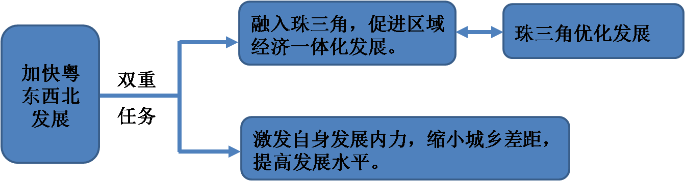 從二元結構理論看,粵東西北實際面臨雙重任務,即要融入珠三角,實現(xiàn)區(qū)域經(jīng)濟一體化發(fā)展,又要激發(fā)自身發(fā)展內(nèi)力,縮小城鄉(xiāng)差距,提高發(fā)展水平。