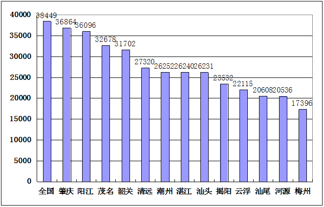 如果把粵東西北作為一個整體來看,人均GDP排在全國倒數(shù)第4位。在全國各省中,人均GDP最高的是江蘇省,最低的是貴州省,兩者差距3.5倍,而在我省各市中,深圳與梅州差距達到7倍多,區(qū)域發(fā)展差距的程度深。