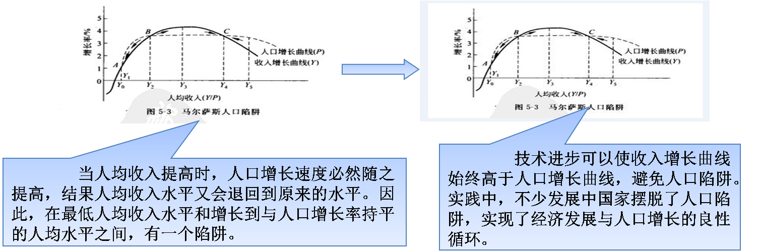 馬爾薩斯人口增長理論:人口增長將使經(jīng)濟始終處于生存水平的狀態(tài),即低水平均衡人口陷阱。