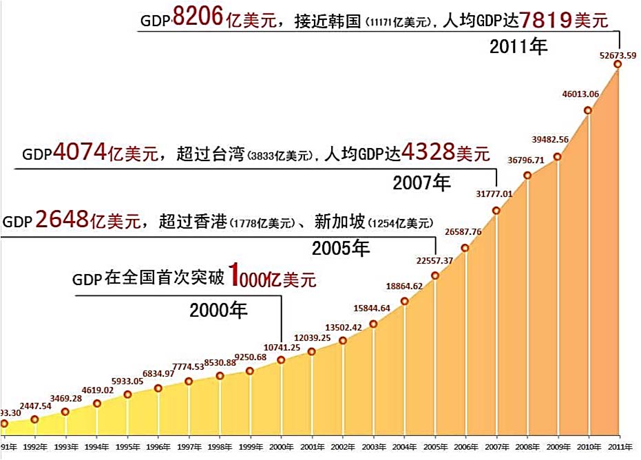 生產總值(GDP):2013年6.23萬億元,占全國比重12.5%。人均GDP超8000美元。1988年以來GDP連續25年全國第一。