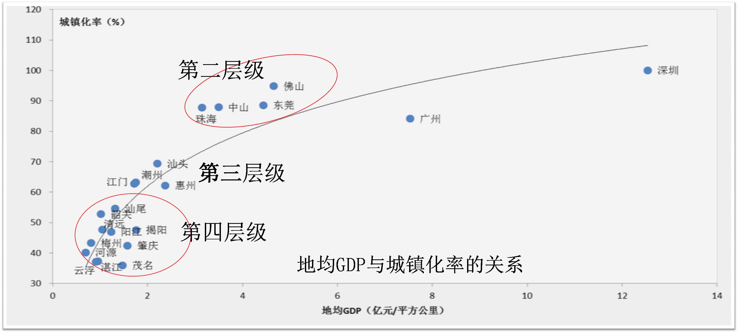 第四層級:粵東西北大部分城市,城鎮化率較低,同時土地效益低,未能形成一定的規模和集聚效應。