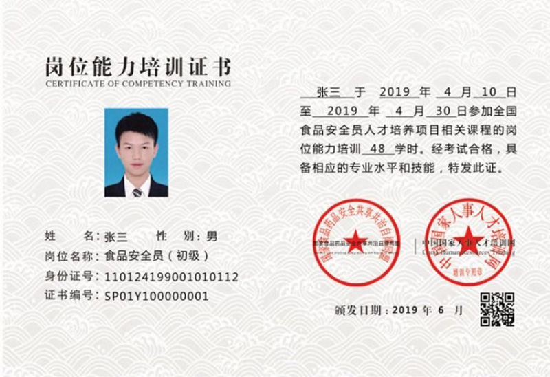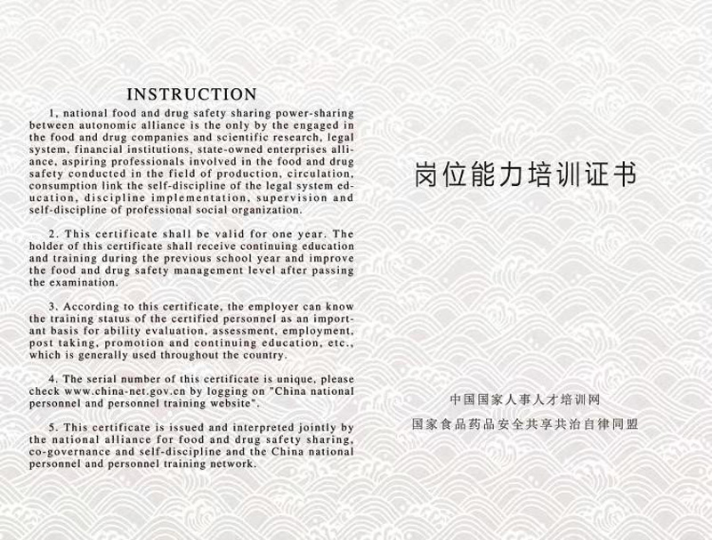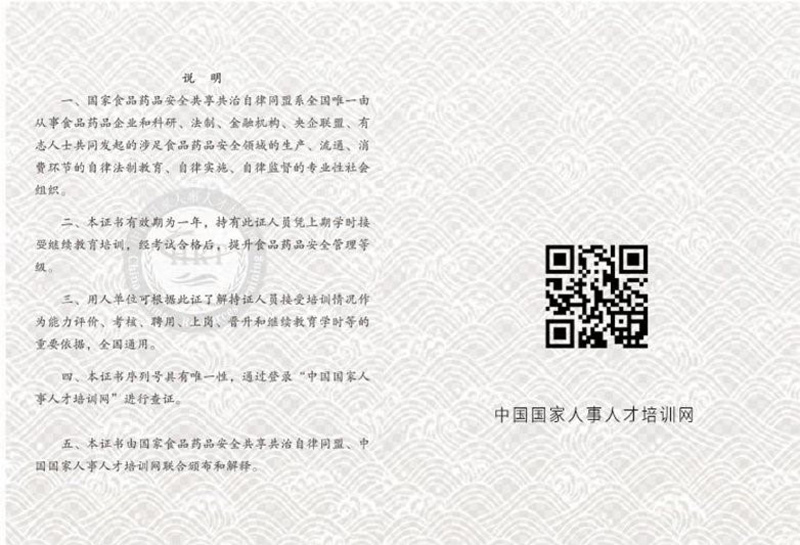 4、發證: 75分以上(含75分) 為考試合格,考試合格者頒發國家食品藥品安全共享共治自律同盟和中國國家人事人才培訓網共同簽章的《食品安全法》學習的結業證書。考試不及格者,經復習后,可再免費復考一次。