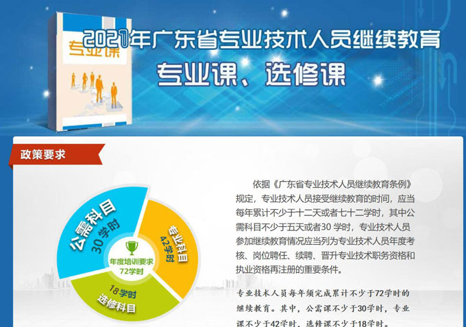 完成繼續(xù)教育年度學(xué)習(xí)任務(wù)。專業(yè)技術(shù)人員必須每年完成累計(jì)不少于90學(xué)時(shí)的年度繼續(xù)教育學(xué)習(xí)任務(wù)。其中,公需科目30學(xué)時(shí),專業(yè)科目42學(xué)時(shí),選修科目18學(xué)時(shí)。公需科目按當(dāng)?shù)厝松绮块T的要求進(jìn)行學(xué)習(xí),專業(yè)科目按行業(yè)主管部門或所在單位的要求進(jìn)行學(xué)習(xí),選修科目的學(xué)習(xí)由個(gè)人與單位商定。