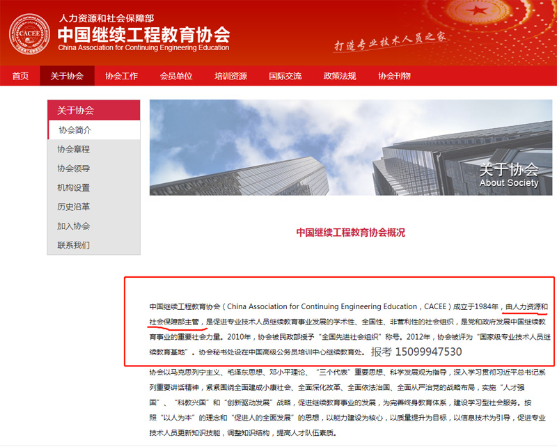 我們通過中國繼續工程教育協會官網介紹可以發現 中國繼續工程教育協會(China Association for Continuing Engineering Education,CACEE)成立于1984年,由人力資源和社會保障部主管,是促進專業技術人員繼續教育事業發展的學術性、全國性、非營利性的社會組織,是黨和政府發展中國繼續教育事業的重要社會力量。2010年,協會被民政部授予“全國先進社會組織”稱號。2012年,協會被評為“國家級專業技術人員繼續教育基地”。協會秘書處設在中國高級公務員培訓中心繼續教育處。