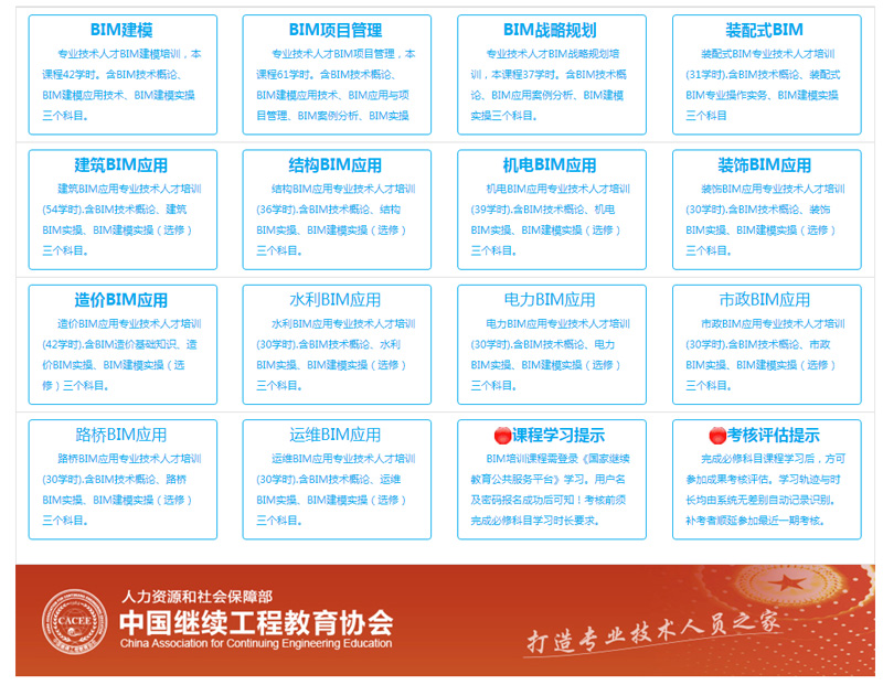 為更好地構建建筑信息模型(BIM)(以下簡稱BIM)專業技術人才的培訓體系,大幅度提升BIM專業技術人才的理論水平和實操能力,推動建筑信息化領域BIM專業技術人才隊伍建設,解決BIM專業技術人才供給不足問題,特實施“建筑信息模型(BIM)” 崗位專業技術人才培訓項目。本項目包含BIM建模、BIM項目管理、BIM戰略規劃、裝配式BIM、建筑BIM應用、結構BIM應用、機電BIM應用、裝飾BIM應用、造價BIM應用、水利BIM應用、電力BIM應用、市政BIM應用、路橋BIM應用、運維BIM應用共十四類崗位專業技術人才培訓。