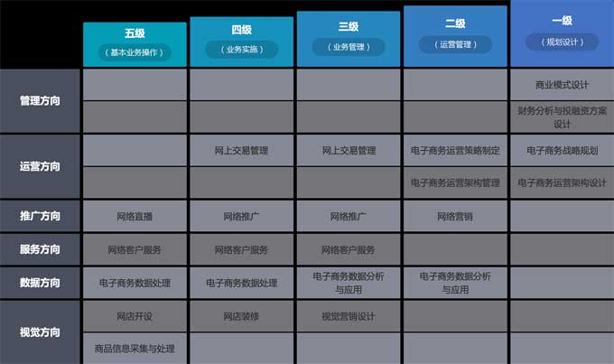 《電子商務師職業技能等級證書》按照標準參照的考試模式,以要求的知識、技能的量的特征(掌握多少、反應快慢等)和質的特征(復雜程度)為依據,分為五級/初級工、四級/中級工、三級/高級工、二級/技師、一級/高級技師五個等級。