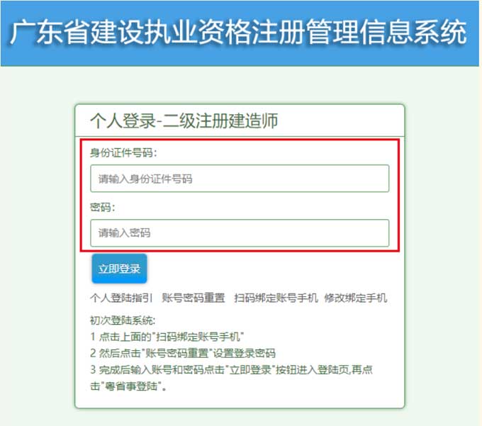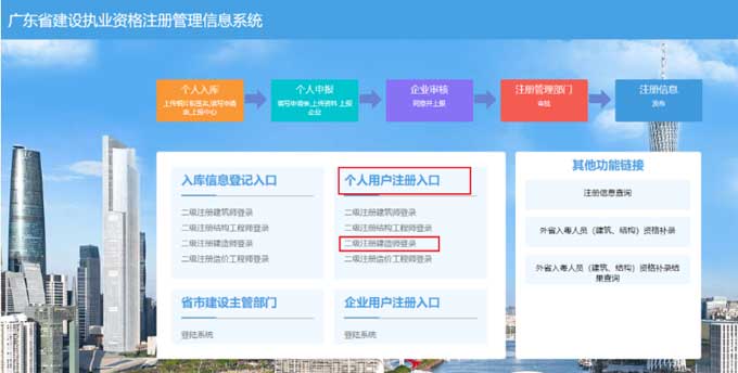 一、登錄廣東省建設(shè)執(zhí)業(yè)資格注冊管理信息系統(tǒng)http://210.76.85.74/,選擇個(gè)人用戶注冊入口,二級(jí)注冊建造師登錄