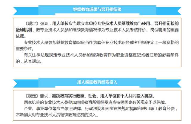 專業技術人員參加繼續教育情況應當作為聘任專業技術職務或者申報評定上一級資格的重要條件。有關法律法規規定專業技術人員參加繼續教育作為職業資格登記或者注冊的必要條件的,從其規定。
