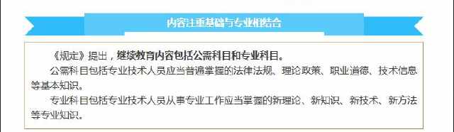 公需科目包括專業技術人員應當普遍掌握的法律法規、理論政策、職業道德、技術信息等基本知識。專業科目包括專業技術人員從事專業工作應當掌握的新理論、新知識、新技術、新方法等專業知識。