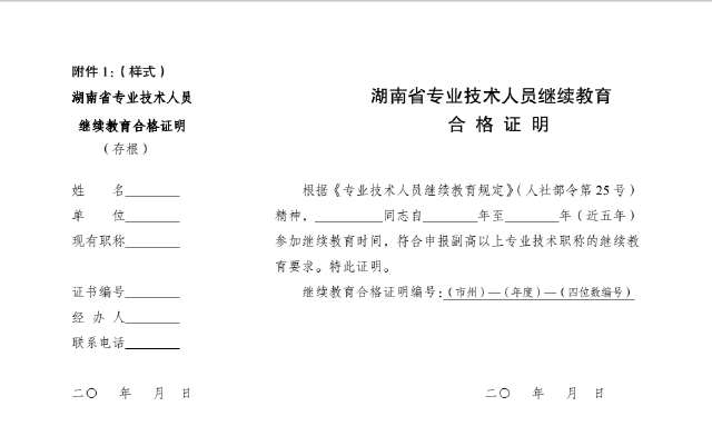 省直部門仍采取繼續教育證書登記制,符合申報副高及以上職稱的專業技術人員繼續教育登記證書領取按《關于做好 2014 年湖南省專業技術人員繼續教育有關工作的通知》(湘人社函〔2014〕118 號)的要求辦理。專業技術人員要認真填寫登記證書,確保信息規范完整;施教機構實施培訓后要對專業技術人員參加繼續教育的種類、內容、時間和考試考核結果等情況進行記錄;主管部門進行初審后予以確認并加蓋印章。對證書登記信息弄虛作假或填寫不完整的,省人力資源社會保障廳一律不予登記,也不辦理繼續教育合格驗證。