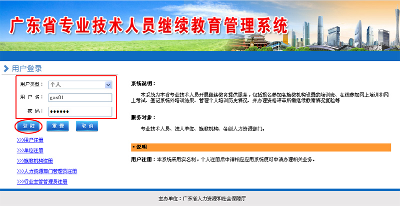 打開IE瀏覽器,在地址欄輸入系統地址,進入登陸界面。選擇【個人】用戶類型,輸入‘登陸名’和‘密碼’,然后點擊【登陸】按鈕,即可進入廣東省專業技術人員繼續教育信息管理系統。 |