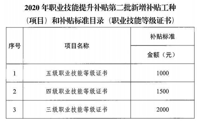 2020 年11月2日,廣東省人力資源和社會保障廳公布了《關于公布了 2020 年職業技能提升補貼第二批新增補貼工種(項目)補貼標準的通知》(粵人社函[2019]295 號)已明確將職業技能等級證書納入補貼范圍。