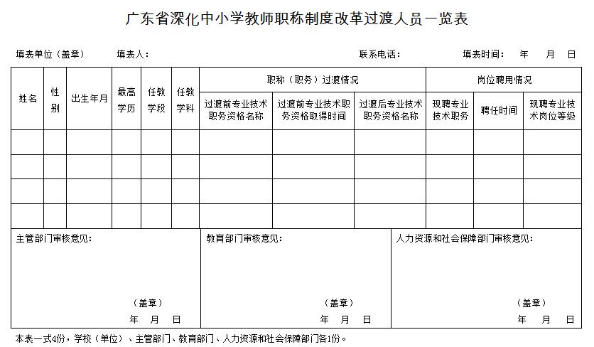 1. 統一填表。學校(單位)對過渡人員的情況認真核查,統一填寫《廣東省深化中小學教師職稱制度改革人員過渡登記表》(見附表1)。