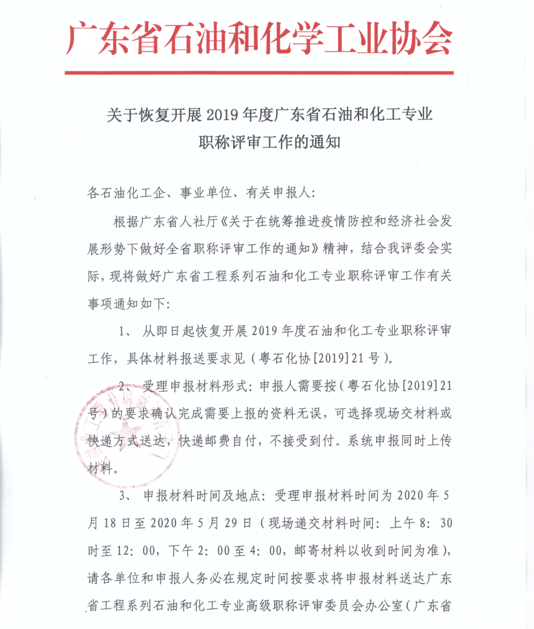 關于恢復開展2019年度廣東省石油和化工專業職稱評審工作的通知