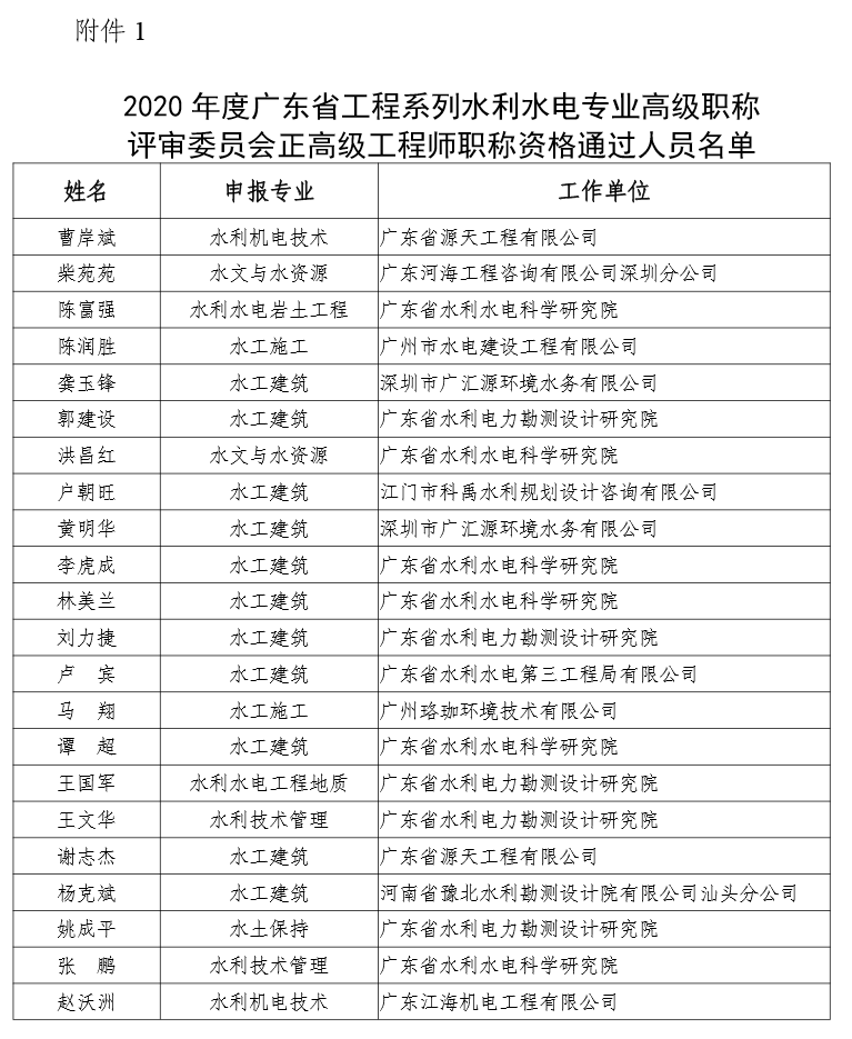 附件:1.2020年度廣東省工程系列水利水電專業高級職稱評審委員會正高級工程師職稱資格通過人員名單