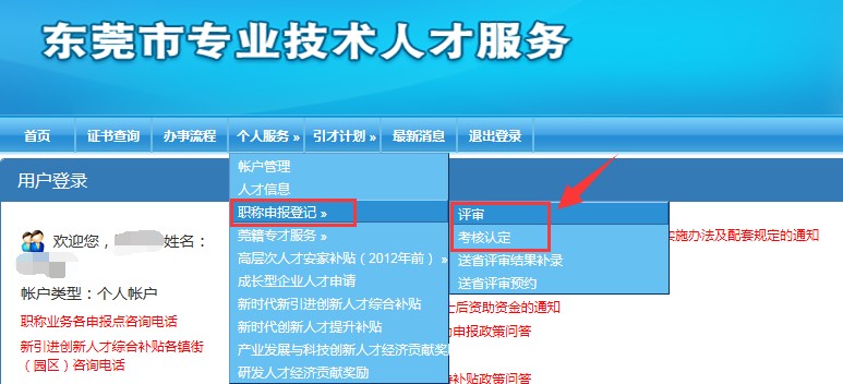 三、個(gè)人線上申報(bào):①申報(bào)人登陸系統(tǒng),點(diǎn)擊“人才信息管理”,完善個(gè)人信息。②選中“個(gè)人服務(wù)”菜單中的“評(píng)審”或“考核認(rèn)定”,如下圖: