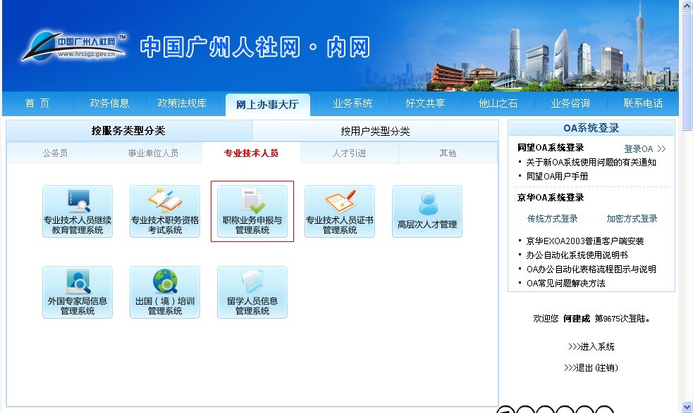 答:主管部門、區縣人事局、人事戶頭、評委會日常工作部門等,在中國廣州人事網內網“網上辦事大廳”欄目中點擊“職稱業務申報與管理系統”鏈接,進入頁面后選擇相應用戶類型進行登陸。
