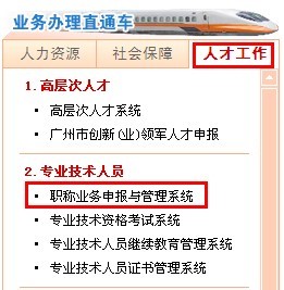 答:進入中國廣州人事網,從“業務直通車→人才工作”欄目中選擇“職稱業務申報與管理系統”進行訪問,或者點擊這里直接登陸。