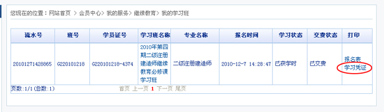 廣東省建設執業資格注冊中心繼續教育系統操作指引面授班:參加繼續教育面授班,網上報名并完成繳費以確認報名后,請打印學習憑證報到上課。請用戶登陸進入“我的學習班”,點擊打印“學習憑證”。(圖5)
