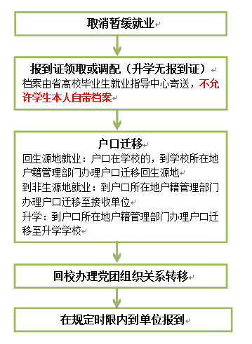 備注:如在暫緩期內,回畢業學校所在省調整改派到廣東省外就業的,取消暫緩時需攜帶改派后新的報到證原件、接收函或調檔函、身份證和暫緩協議原件辦理相關手續。
