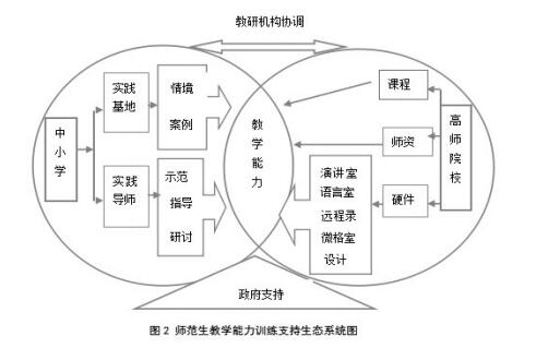 (三)生態架構:形成良性互動的課堂教學技能訓練系統環境“有機體與周圍環境之間的關系”是“生態”的科學概念內 涵。教師教育是一個系統工程,教師培養的環境及各種條件的交互同樣構成一個教育生態環境。基于培養優質師資的社會期待和追求,架構起一個由師范生院校主導、政府支持、教研機構(如教科所)協調、中小學參與的教師教育生態環境,對于形成教師教育合力,促進教師培養多方良性互動,推動形成師范生教學能力有重要價值。如圖 2 所示。