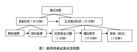“暫行辦法”規定了面試的辦法,即“通過抽題、備課(活動設計)、回答規定問題、試講(演示)、答辯(陳述)、評分等環節進行”,并借助結構化面試和模擬情境教學來考查。通常,面試分兩個階段。第一階段,面試準備階段(40 分鐘),所有考生集中預備室,明確面試的過程和要求,并進行面試次序抽簽。接 著,第一位考生在引導員的帶領下,進入備課室,在電腦上隨 機抽取面試題目,開始備課。第二階段(20 分鐘),備課時間滿 20 分鐘后,在引導員的指引下進入面試考場,正式面試。第二 位考生接著上位,依此類推。面試考場一般由三個或五個具有 相應學段學科背景的專家、教育管理者和一線教師組成評委 組。分兩個環節:一是回答規定問題。面試開始,主考官首先致 歡迎詞,接著提 2-3 個問題,側重考查應試人運用教育學和教 育心理學知識來理解教育現象和解決教育實際問題的能力, 用時 5 分鐘。二是模擬教學。就備課課題作十分鐘模擬教學, 完后考官就教學內容和教學過程提問,側重于考查應試人擬 任教學科或專業領域教學的基本知識,通常涉及到教學設計 思路、教學應變方法或教學評價等方面。比如:蘇軾《水調歌 頭》模擬教學后的答辯題目:“1.請你談一下你用什么方法能更 好地讓學生背誦下這首詞?2.如果你的課堂里有位學生暈倒 了你該怎么辦?”時間為 5 分鐘。整個面試的過程及時間分配、