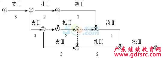 74.【題干】某鋼筋混凝土基礎(chǔ)工程,包括知模板、綁扎鋼筋、澆筑混凝土三道工序。每到工序安排一個(gè)專業(yè)施工隊(duì)進(jìn)行,分三段施工,各工序在一個(gè)施工段上的作用時(shí)間分別3天、2天、1天,關(guān)于其施工網(wǎng)絡(luò)計(jì)劃的說(shuō)法,正確的有( )。